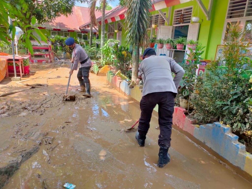 GORONTALO (RAGORO) – Cuaca ekstrem dengan curah hujan tinggi yang melanda provinsi Gorontalo akhir-akhir ini, menyebabkan beberapa daerah mengalami banjir, salah satunya di wilayah kecamatan Tibawa, Kabupaten Gorontalo. Dimana salah satu sekolah yakni SDN 1 Kecamatan Tibawa Kabupaten Gorontalo terendam banjir. Melihat peristiwa bencana alam tersebut, Personil Brimob Polda Gorontalo yang sedang siaga SAR langsung menuju SD 1 Tibawa untuk membersihkan lumpur sisa banjir.