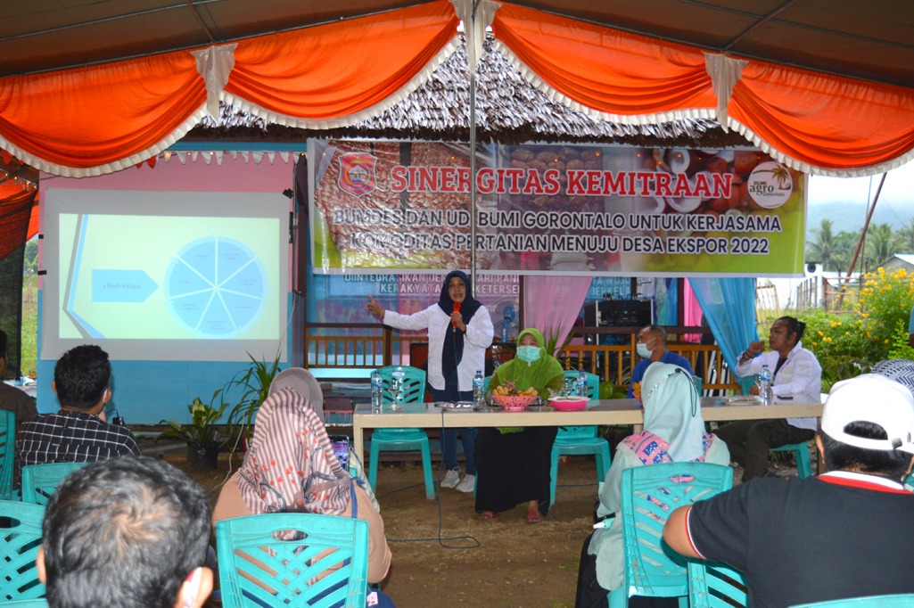 BONE BOLANGO (RAGORO) – Direktur Utama UD. Bumi Agro Gorontalo, Salmawaty Tansa, menyatakan melalui sinergitas kemitraan ini, pihaknya akan membuat sinergitas kerja sama yang nantinya akan dituangkan dalam perjanjian kerja sama dengan Badan Usaha Milik Desa (BUMDes) di Bone Bolango. ”Saya hadir disini, sebagai pihak ketiga yang akan membantu sinergitas komoditas pertanian yang ada di Bone Bolango untuk kita sama-sama ekspor ke luar negeri,” ujarnya Salmawaty Tansa saat memberikan pemaparan pada kegiatan sinergitas kemitraan antara BUMDes dan UD. Bumi Agro Gorontalo untuk bekerjasama komoditas pertanian menuju desa ekspor 2022, di Asmara Garden, Desa Bulotalangi Timur, Kecamatan Bulango Timur, Sabtu (13/11/2021).
