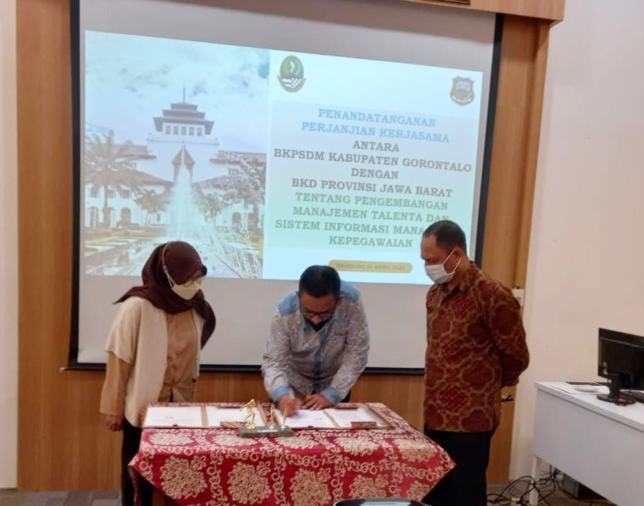 Hal itu ditandai dengan penandatanganan kerja sama (PKS) oleh Kepala Badan Kepegawaian dan Pengembangan Sumber Daya Manusia (BKPSDM) Kabupaten Gorontalo Zubair Pomalingo dengan Sekertaris Badan Kepegawaian Provinsi Jawa Barat, Yulia Dewita.
