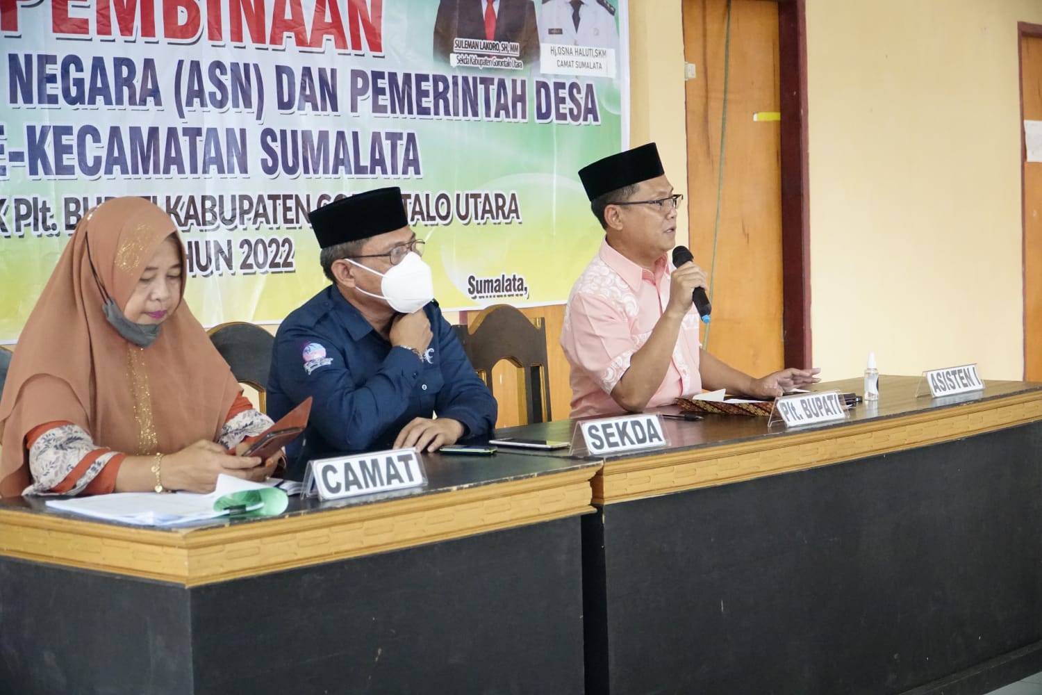 Plt Bupati Gorut, Thariq Modanggu didampingi Sekda Gorut, Suleman Lakoro dan Camat Sumalata, Osna Haluti saat silaturrahmi sekaligus memberikan pembinaan kepada ASN, perangkat desa dan PTT di wilayah Kecamatan Sumalata, belum lama ini. (Foto : hmskominfo_gorut)