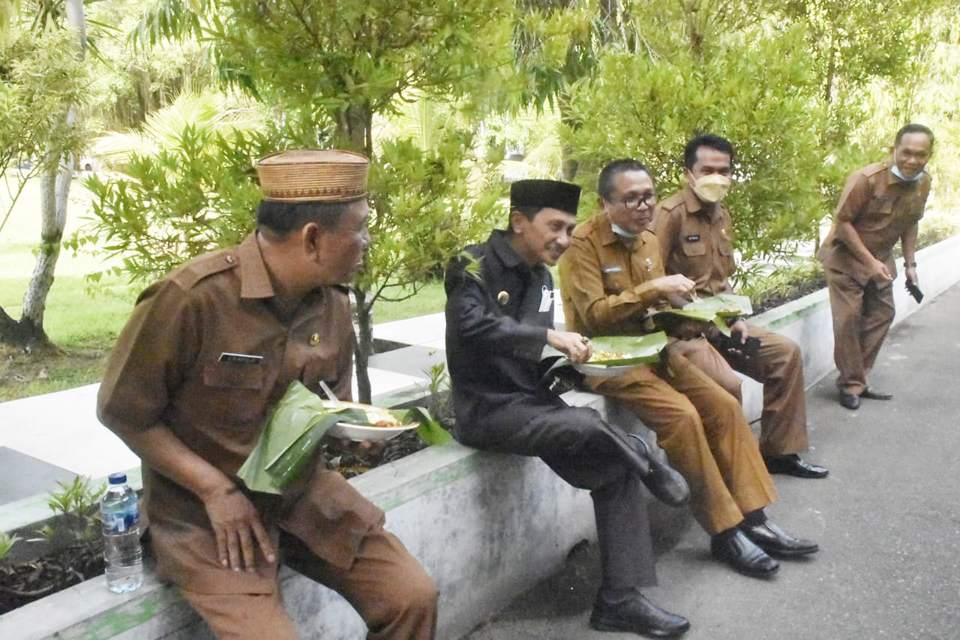Larut bersama dan duduk ditaman dihalaman kantor Bupati dengan staf dan pimpinan OPD makan bareng nasi Kuning.