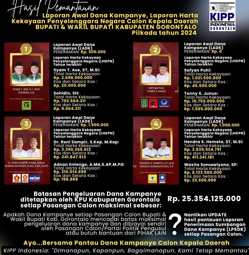 Ini sesuai data yang dipublis oleh Komiten Independen Pemantau Pemilu (KIPP) Indonesia-Gorontalo, sedangkan laporan dana awal kampanye pasangan ini tidak ada datanya karena tertera angka o.