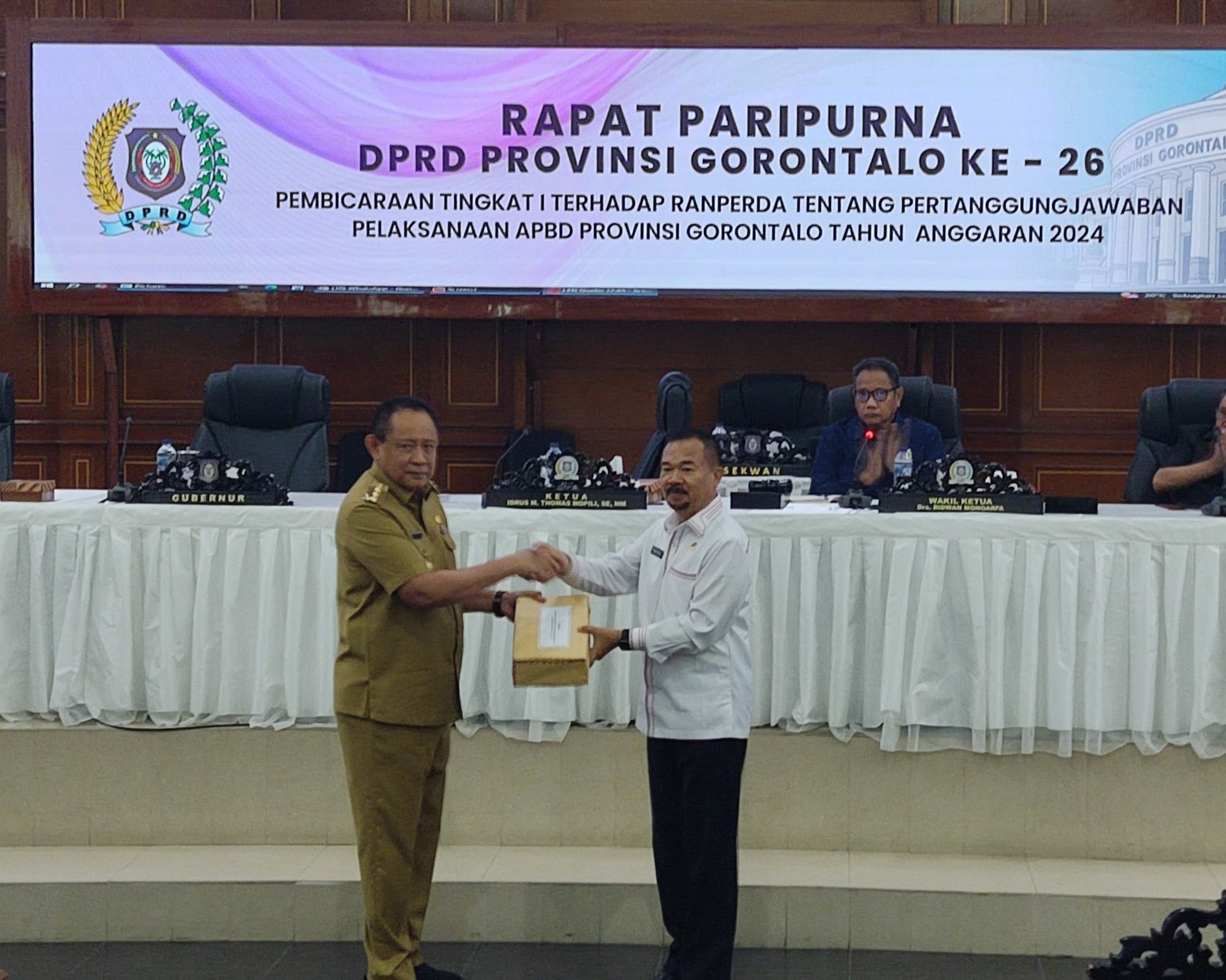 GORONTALO (RGNEWS.COM) – DPRD Provinsi Gorontalo menggelar Rapat Paripurna DPRD Provinsi Gorontalo ke 26, Pembicaraan Tingkat I Terhadap Ranperda Tentang Pertanggungjawaban Pelaksanaan APBD Provinsi Gorontalo tahun 2024, Senin (16/6/2025) yang dipimpin Ketua DPRD Thomas Mopili.