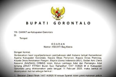 KABGOR – Pemerintah Kabupaten Gorontalo menerbitkan Surat Edaran Nomor: 450/247/Bag.Kesra mengenai penetapan besaran dan mekanisme pengumpulan Zakat Fitrah 1447 Hijriah/2026 Masehi. Berdasarkan hasil rapat koordinasi lintas sektoral, nilai zakat fitrah tahun ini ditetapkan sebesar 2,5 kilogram beras kualitas terbaik atau setara dengan uang tunai Rp40.000 per jiwa.